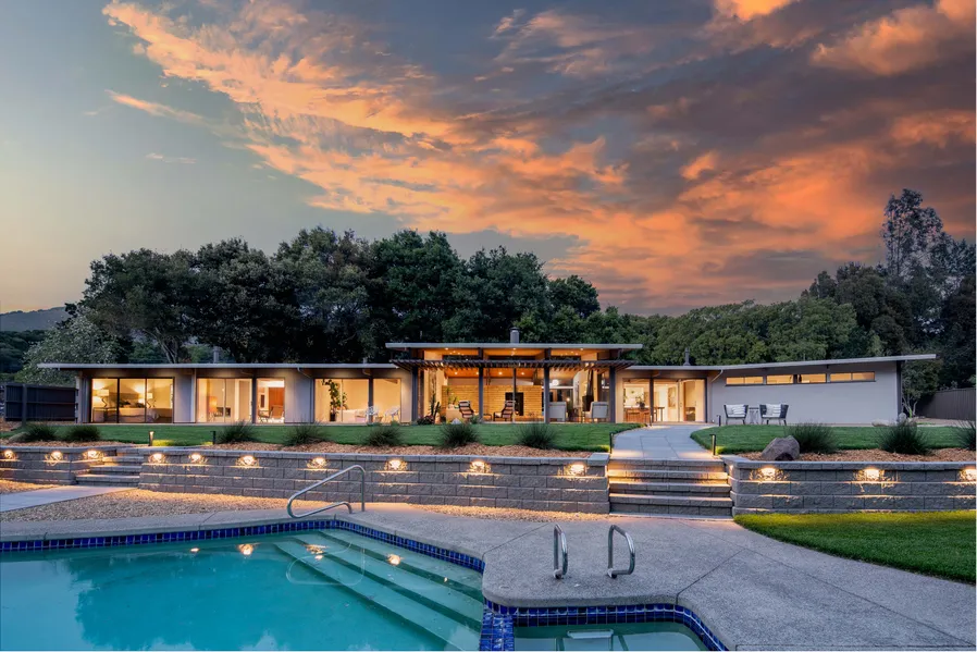 Behind a tree-lined gated entry just past the vineyards of Bernardus Lodge is a stunning mid-century modern estate, lovingly restored and upgraded to perfection. The house retains the original integrity of its mid-century design with sleek lines yet modern functionality, abundant windows and skylights bringing the outdoors in, and a pool with outdoor living space youll be able to enjoy year-round. The simple lines and use of mixed materials and textures such as the vaulted redwood ceilings, hardwood floors, and expansive, period (1965) walnut cabinetry are juxtaposed against sleek travertine in the baths, quartz countertops, Italian stainless-steel appliances in the modern open kitchen, and glass doors and windows with open views of Garland Ranch vistas. There are two expansive master bedroom suites with sitting rooms and fireplaces, and many more amenities and unique upgrades too extens...