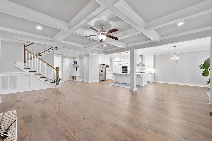Welcome to The Estates at Chapel Ridge, a premier gated community offering resort-style amenities and an exceptional lifestyle. This immaculately maintained stunning home sits on 1.78 acres and features 5 bedrooms, 4 baths plus a bonus room and dedicated office, providing both space and flexibility. The expansive open floorplan is anchored by a first-floor primary suite, while the chef's kitchen boasts high-end finishes, abundant cabinetry and generous workspace. A huge screened porch with an attached deck makes entertaining seamless and the family room with fireplace is the perfect place to gather. Beautiful coffered ceilings in both the dining and family rooms add elegance and architectural detail. Thoughtful details include a 3-car garage, abundant storage, and a Generac whole-house generator for year-round comfort and peace of mind. The neighborhood elevates daily living with an impressive list of amenities: pool, tennis courts, fitness center, playground, clubhouse, picnic and barbecue areas, plus a party room - requires membership and additional costs. This home has barely been lived in, the condition is like new. Located within minutes from historic downtown Pittsboro, UNC-Chapel Hill and UNC Hospitals. Please remove shoes.