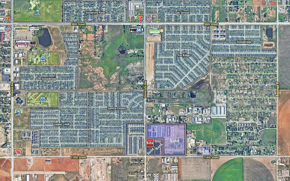 Large development tracts available in south Lubbock. These tracts are conveniently and strategically positioned between three main highways, Loop 289 (2 miles north), Interstate 27 (2 miles east), and the currently being constructed Loop 88 (2 miles south). Less than a 5-minute drive away from Super Walmart, Walmart Neighborhood, HEB, and United Supermarkets. Texas Tech University, University Medical Center, & Covenant Health Systems are only a 15-minute drive away.