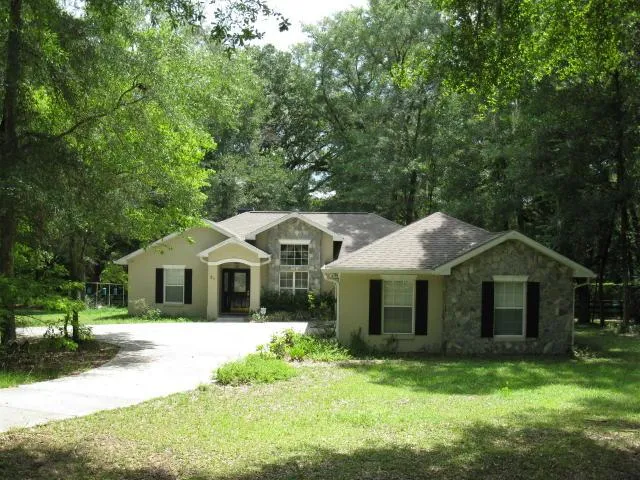 REDUCED PRICE! LOVELY 3/2 CUSTOM HOME nestled in the oaks at Meadow Wood Farms. Home offers tasteful upgrades including granite countertops and a 25K watt generator which offers uninterrupted power. Lots of woodwork detail, high ceilings, fireplace, & Jacuzzi in master bath. 2 stall barn with tackroom & storage areas for hay & trailer plus 2 fenced paddocks.