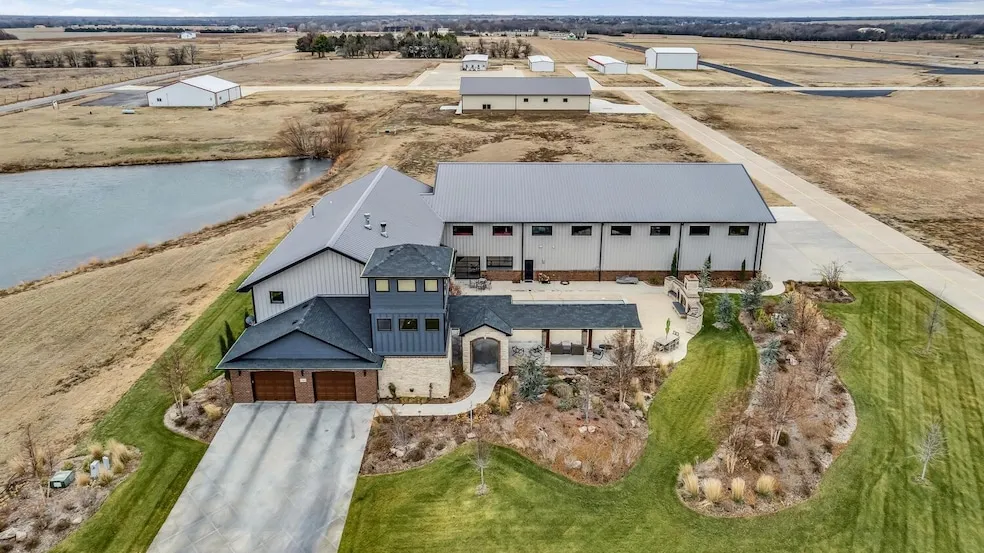 This breathtaking 7,200+ sq ft luxury hangar home is the epitome of elegance, innovation, and functionality, perfectly positioned on 2 private acres overlooking the exclusive runways of Cook Airfield. Every detail has been meticulously crafted to create a masterpiece for those who demand the very best. The open-concept main floor is flooded with natural light through soaring floor-to-ceiling windows that frame unparalleled views of the pool, outdoor living space, and runway. A grand 2-story stone fireplace anchors the living area, while the chef s kitchen boasts a massive granite island, double ovens, a gas range, custom cabinetry, walk-in pantry, and a coffee bar, creating the ultimate space for entertaining in style. The master suite is a sanctuary of luxury with a private patio, spa-inspired bath, and custom walk-in closets, including a dressing room with built-ins. On the upper level, indulge in a private entertainment lounge complete with a wet bar, wood-burning fireplace, and two lavish ensuite bedrooms, while the third-floor tower office offers 360-degree panoramic views of the airfield. The finished basement provides a state-of-the-art storm shelter with concrete walls, steel fire doors, and extensive storage. The 60x100 hangar redefines sophistication with radiant and epoxy floors, a heated/cooled clean room with car lift capabilities, and a stunning 25x40 entertainment room featuring a full kitchen, granite bar, and polished concrete floors, all opening seamlessly to the resort-style pool area. Outside, enjoy a 20x40 pool with a sun deck, stone fireplace, built-in grill, waterfall feature, and impeccable landscaping, making this estate the ultimate oasis. Designed for discerning pilots, car enthusiasts, and luxury entertainers, this extraordinary property delivers the perfect blend of grandeur and practicality truly a one-in-a-million estate.