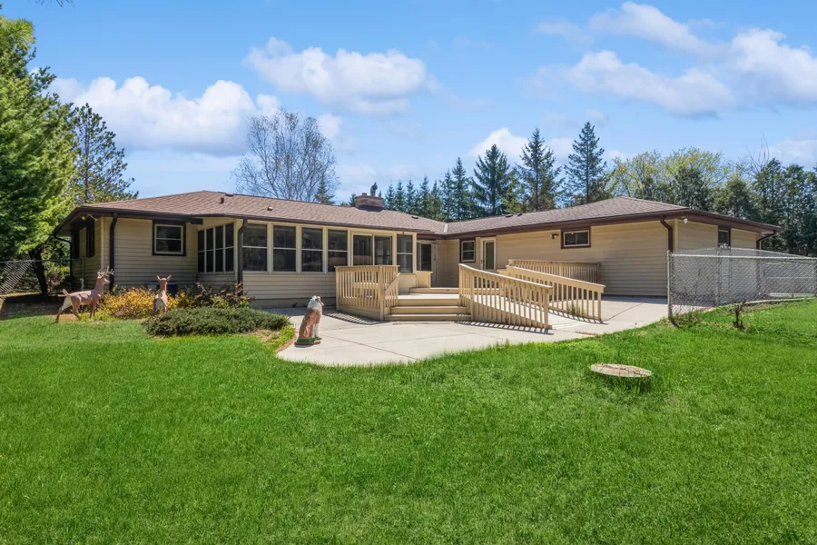 Country Living at its Best, Lovely Ranch Home with 1.81 acres, Home nestled in a wooded area, Includes 3Beds, 2Full Bathes, with First Floor Laundry. A spacious Family Rm, accented with Floor to Ceiling Fireplace for cozy evenings, adjacent patio doors to enjoy Summer Events on a very large wood Deck overlooking a private back yard. Seller built 12 yrs ago 4-season sunroom 12 x 20 with access to the Family Rm. and back yard. The home's exterior is maintenance free. Seller is providing a 1Year Home Warranty.