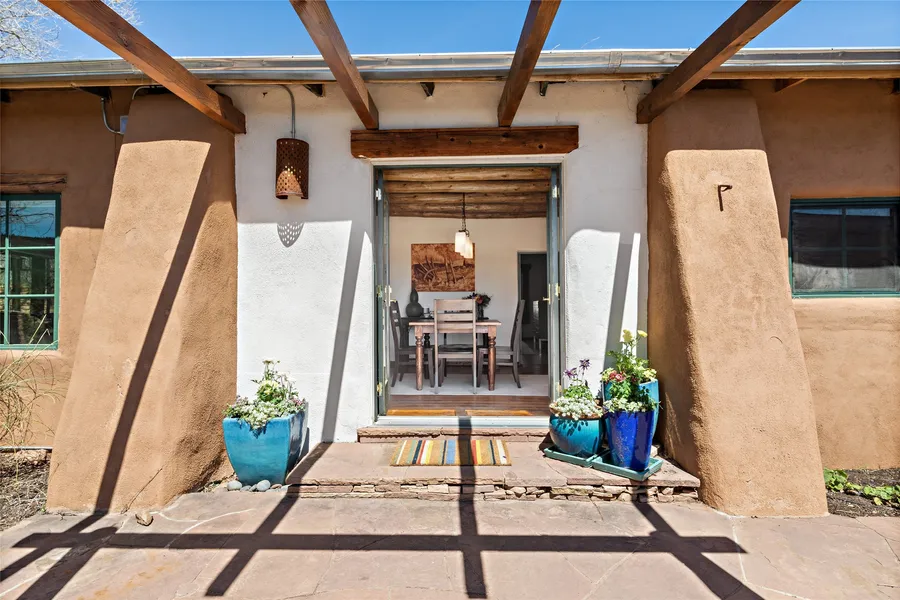 An easy 30-minute commute to downtown Santa Fe, these two adjoining properties comprise just under two acres in the rustic village of Rowe, offering 360-degree views of the picturesque Rowe Mesa and Sangre de Christo mountains. The tree-shaded landscaping is an idyllic setting for the flagstone patio, portales and a gardened courtyard enclosed by an adobe brick wall. The main house has two bedrooms, a full bathroom with soaker tub and a comfortable office space, all with updated electrical, plumbing and windows. The newly renovated kitchen features beautiful white quartz countertops, stainless steel appliances and a large inset sink, perfect for the home chef. Bright, light-filled rooms offer all the charm of the northern New Mexico style, including original vigas and wide-planked pine floors. The adjoining property, on a shared well with the main house, has a one bedroom/one bathroom casita with a fenced garden area; perfect for guests, rental or an ideal artist's studio. Also on the property are a carport and small horse corral. The houses lie on the frontage road of Rowe Village, providing easy access to I-25 and splitting the distance between Santa Fe and Las Vegas.
