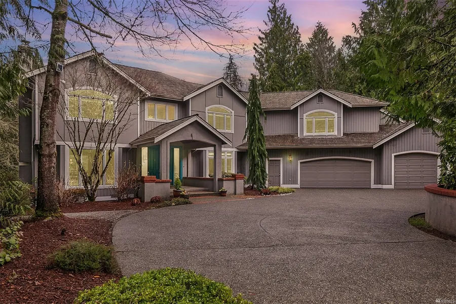Welcoming lifestyle 'flex' on shy 2 acre Thornbury Estates home - a quick 15 min to dwtn Redmond on 202. Walls of windows grace 6116 sf-5Bd/6Bth. Main level- Vaulted entry w/curved staircase. Formal LR w/boxed ceiling leads to gracious dining room. Essential spaces for expanded 'at home' zones. Kitchen offers Wolf, Miele, hot spot,Granite slab, breakfast nook. Refinished true hardwoods. Family room w/wet bar. Formal office. Upstairs - find Primary suite, 2 more bedrooms with a Full bath on hall. Plus Bonus/theater room w/mini kitchen & 3/4 bath. Basement 'levels up' - 700 bottle wine cellar, mini kitchen, rec room, 2 bds, 6-person sauna & 3/4 bath. Expansive patio/decks, gardens, terraced lawn & play areas. 3 gar w/EV Chg Virtually staged.