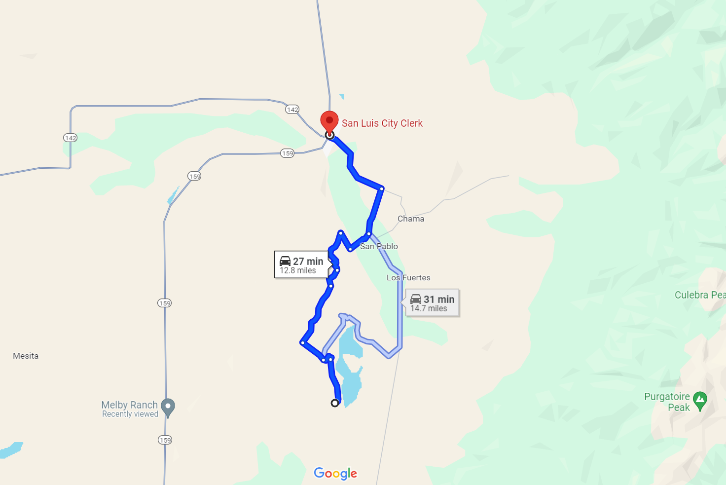 Closest Town/City: San Pablo, Colorado 81152 - 23 mins (9.1 miles)
