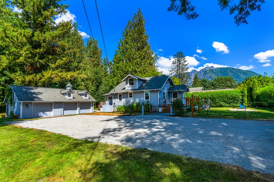 Privately placed at the end of a quiet dead-end street, this North Bend estate is breathtaking. Majestic views of Mt Si from the grounds. This well-appointed country-cottage-style home has new hardwood floors and windows throughout. Tastefully updated to honor the classic style of the cottage. Relax on your covered deck, and enjoy the serenity of your private park-like grounds. Perfect for entertaining, and recreation, the yard spaces offer fruit trees and plenty of garden space. The extra-large three-car, detached garage is an added bonus. Close to I-90 for commuting, it is also within a few blocks of the popular downtown North Bend shopping district, which is filled with boutiques, and restaurants and is brimming with historic charm.