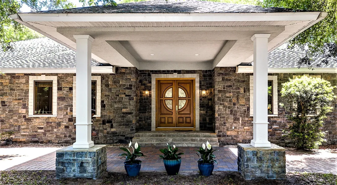 As you pass through the gate of Governor's Plantation, you will notice the charm of the community as you weave your way along the tree-lined road & over the wooden bridge to one of the largest homes in the community at 4,093 sq. ft. and also one of the largest in acreage at 1.85 acres. As you drive up the paver driveway & underneath the portico, you will be struck by the elegance of this English Styled Manor home and the strength it exudes from the stone exterior and concrete block construction. After entering through the solid oak doors into the foyer, you will see the cherry herringbone wood flooring (also located in the dining room, living room & master bedroom) along with the oak crown & base molding found throughout the home. The living room features a marble mantled, two-sided fireplace and a circa 1890s, imported English bar. With intricate carvings and stained glass and mirror accents, any party you host will have a sense of sophistication. The fireplace flue is made from Isokern, a volcanic stone imported from Denmark. The great room features a stone chimney and wood mantle from the opposite side of the fireplace. A set of French Doors leads to the backyard. The four guest rooms are found on one wing of the home along with 2 Guest Baths, one a Jack and Jill. Your formal Dining Room can easily accommodate any large social gathering. The Kitchen has granite countertops, wine chiller, wine rack and ample storage with its solid, oak cabinetry and two pantries. The other wing of the home contains the Master Bedroom and Bath, Office and Vault Room. The Master Bedroom is quite large with 2 walk-in closets. The Master Bath has recently had a new shower installed along with double vanities and a jetted tub. The office looks out to the huge backyard. Other features include an enormous, 4-car garage, a storage room inside the garage, laundry room, a full house generator, 3 HVAC systems (one new and one a year old), 2 septic systems and 2 hot water heaters.