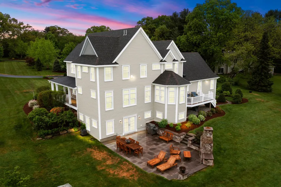 This magnificent 2013 custom-built home on 1.88 acres of lush landscaping is truly a dream, with no detail overlooked. Every room of this executive home was thoughtfully designed and tailored to fit the needs of today's lifestyle. The main level features a wide-open floor plan with a chef's kitchen, center island, breakfast bar, walk-in pantry, and a beautiful eat-in area with a double-sided fireplace, spacious back deck, and lovely views of the private backyard and patio. A sun-lit living room, oversized dining room, private study, and a king-size bedroom with an ensuite bath complete the first floor. Upstairs you will find a grand primary suite with a gas fireplace, walk-in closet, an en-suite bath with dual vanities, a free-standing tub, and a glass-enclosed shower. Three additional spacious bedrooms with attached baths and a laundry room round out the second floor. The finished attic space is the ideal bonus room while the finished basement is the perfect place to continue the party - a full custom stone bar, pool table, and entrance to an oversized patio with wood burning fireplace will have you entertaining all year long! A gym with floor-to-ceiling mirrors, a full bath with steam shower, and separate unfinished space for storage complete the lower level. A three-car garage, wide plank hardwood floors, custom built-ins, and top-of-the-line finishes throughout complete this absolute must-see home.