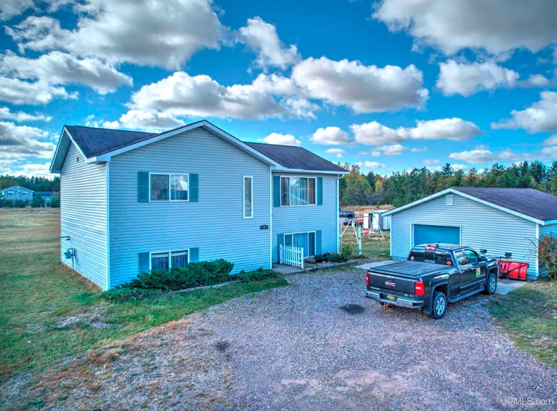 Welcome to this spacious and well-maintained home situated on a generous 1.89-acre lot in Gwinn, MI. This bi-level home offers 3 bedrooms and 3 full bathrooms plus a spa room with a corner jetted tub, with a total of 1,950 square feet of living space. The property boasts a finished lower level, adding versatility and universal extra living area or double as a 4th bedroom. As you approach, you'll notice the attractive exterior and well-kept grounds. The detached 2-car heated garage (new roof 2025) provides ample space for vehicles with a closet room and half bath. It also can double as a bar/man cave (bar and refrigerator included) . Step inside to discover a thoughtfully designed interior with an open floor plan, perfect for modern living and entertaining. The main level features a bright and airy living room that flows seamlessly into the dining area. Large windows throughout allow plenty of natural light to flood the space. The kitchen is a chef's delight, offering ample cabinet space and a convenient breakfast bar for casual dining. The three bedrooms are generously sized, with the primary bedroom featuring an en-suite bathroom for added privacy. The additional upper level full bathroom ensures comfort and convenience for family and guests alike. Step out on the large patio with a beautiful view. The patio leads to a fenced in area and extra storage underneath for outdoor equipment. The lower level of the home offers a spacious bedroom and a full bathroom with an extra spa room (with a jetted tub)! This also provides universal space for families with kids or adult entertainment. Adding a long closet behind the keyboard wall with a full spa room behind. Extra large windows with black out curtains on both levels. Large deep closet under the stairwell as well. Outside, the expansive 1.89-acre lot provides plenty of room for outdoor activities, gardening, or future expansion. Small garden shed included. The deep lot (500 ft) offers plenty of space for building or another future home site! Located within walking distance to Gwinn High School this home is conveniently situated near local amenities while still offering a peaceful, residential setting on the edge of town. Built in 2002, this home combines modern conveniences with timeless appeal. With its spacious layout, ample acreage, and prime location, this property presents an excellent opportunity for those seeking a comfortable home and a place to enjoy UP living at its finest. Don't miss your chance to make this lovely Gwinn home yours. Schedule a viewing today and experience the charm and potential of 51 E Maas Street for yourself!