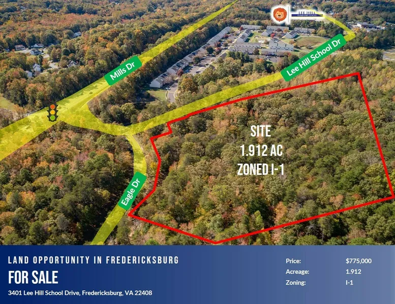 3401 Lee Hill School Drive presents a rare opportunity to acquire1.912 acres of Industrial (I-1) zoned land strategically positioned in the heart of the fast-growing Spotsylvania / Fredericksburg market. Located just moments from Interstate 95 at Exit 126, the site offers exceptional access to regional and interstate transportation networks and is situated less than300 feet from Route 17, a major commercial corridor. The property benefits from corner frontage along Lee Hill School Drive and Eagle Drive, enhancing visibility, ingress/egress options, and future development flexibility. The parcel is mostly level and wooded, reducing site preparation costs and enabling a more efficient development timeline.