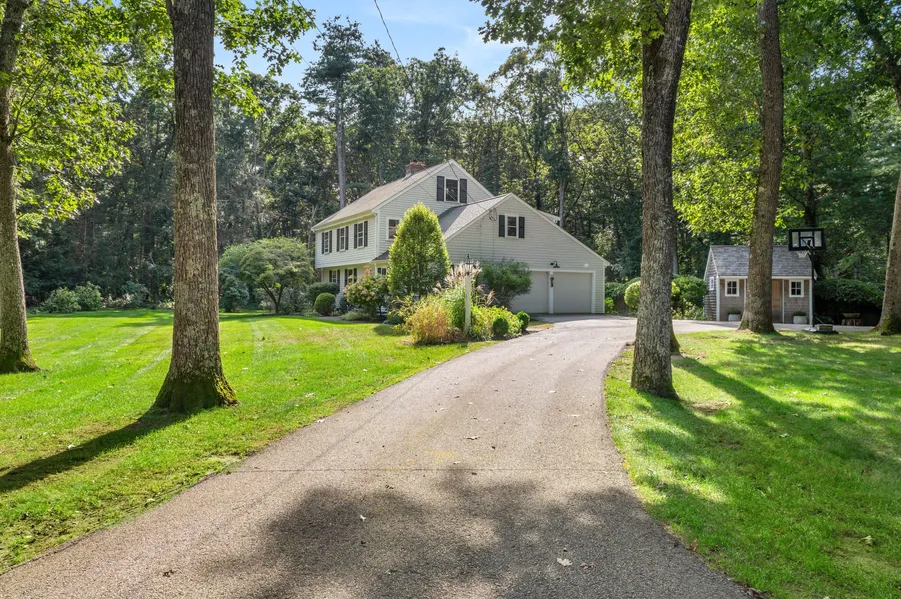 Imagine living in a picturesque Colonial beautifully tucked away on nearly two acres of lush, landscaped grounds. The circular drive welcomes you into this property in the desirable Claypit Hill neighborhood. To the left of the front entrance, you will find an impressive living room highlighting a gorgeous wood-burning fireplace. The bright & sunny kitchen leads to an open-concept dining room offering a comfortable space for entertaining with views of the magnificent backyard. First-floor office/ den allows for excellent work-from-home space and features custom built-ins. Upstairs, the four spacious bedrooms offer a haven of tranquility. The primary suite includes hardwood floors & full bathroom. The lower-level playroom has been stylishly updated. Outside, the backyard oasis provides a serene retreat with a spacious deck ideal for outdoor dining and a well-maintained lawn perfect for play or gardening enthusiasts. Move right in! Fabulous location- close proximity to school & conservation trails!
