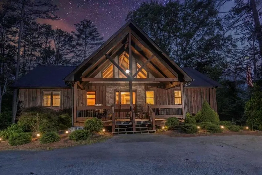 Welcome to Bootleg Mountain, a premier cabin community in Morganton, GA! Offering a Modern Rustic Retreat Minutes from Downtown Blue Ridge - 3 Bed | 3.5 Bath | 1.95 Acres. Fully furnished and packed with upgrades, this 3BR/3.5BA cabin blends modern comfort with rustic charm on a private, wooded 1.95-acre lot with paved access. Enjoy the expansive wrap-around deck with outdoor fireplace, perfect for relaxing by the sounds of the nearby mountain stream. Inside, the open great room features vaulted ceilings and a stunning double-sided stone fireplace. The kitchen includes granite counters, a walk-in pantry, and upgraded fixtures throughout. Main level offers a spacious primary suite with a custom tile shower. Upstairs loft is ideal for kids or an office. Terrace level has a separate entrance, game room with wet bar, fireplace, and two guest suites. Minutes from Lake Blue Ridge, Lake Nottely, hiking, and biking. Turnkey and rental-ready! Star-link internet