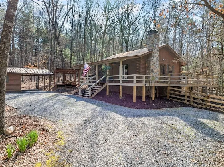 Storybook Log Home in Blackberry Mountain!Step into a true mountain fairytale. Just minutes from downtown Ellijay, beyond the stunning timber-frame bridge over the rushing Cartecay River, lies this private retreat in the exclusive, gated Blackberry Mountain community. Nearly two acres of gently rolling land give you space to roam complete with your own nature trail, a cozy fire pit for starlit evenings, and a detached garage/workshop/studio for your hobbies or projects. From the moment you arrive, the wraparound deck and spacious covered front porch invite you to slow down, breathe in the crisp mountain air, and take in the peaceful surroundings. Inside, cathedral ceilings tower over the living room, where a stone fireplace with a wood-burning stove creates the perfect gathering place. The open floor plan blends warm tongue-and-groove wood with smooth sheetrock, giving the home a cozy yet light-filled feel. Two inviting bedrooms, a modernized bath with a brand-new walk-in tile shower, and a charming mini loft ideal for an office, reading nook, or guest space make this home as functional as it is beautiful. Here, every day feels like a getaway. Enjoy exclusive community access to the Cartecay River and a tranquil fishing pond, or simply stay home and let nature be your backdrop. Whether you re looking for a weekend escape or a full-time mountain lifestyle, this move-in ready log home is a rare opportunity you won t want to miss.