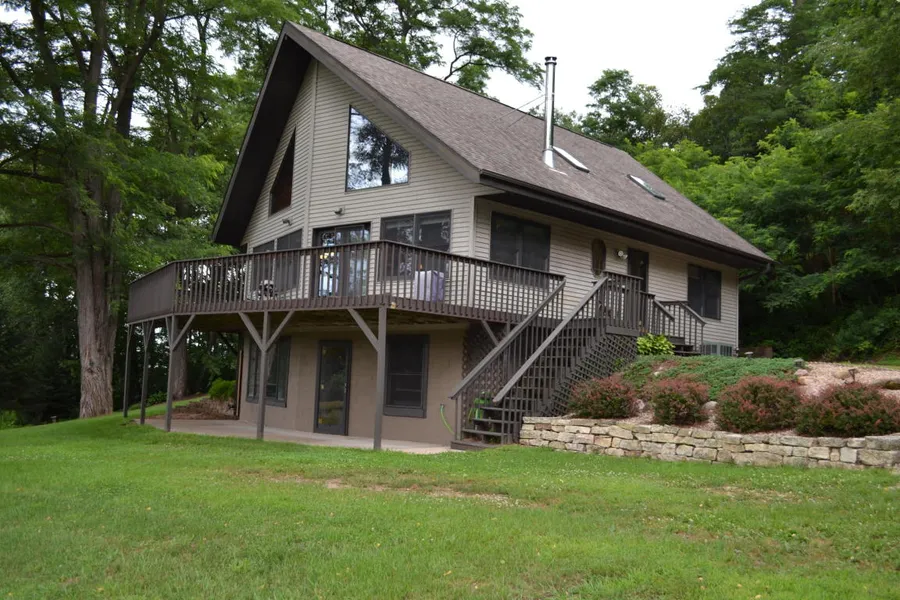 A home for all Seasons. This beautiful well kept A-Frame makes you feel like you are not only in the country but also on vacation at the same time. Perched upon a hill for views also allows the lower level to become useable square footage as well. Neat, clean & move-in ready. This home sits on the edge of Mindoro so is convenient to town but additionally has the benefits of city sewer & water. The floor plan is great for family living with extra space for all with sunshine galore & vaulted sky lit ceilings. The lower level is not only look-out but walk-out as well which adds to the flexibility of total living space for guests. The acreage is a combination of landscaped yard, woods & garden. The garage is any man's dream with high ceilings and space for all the toys.