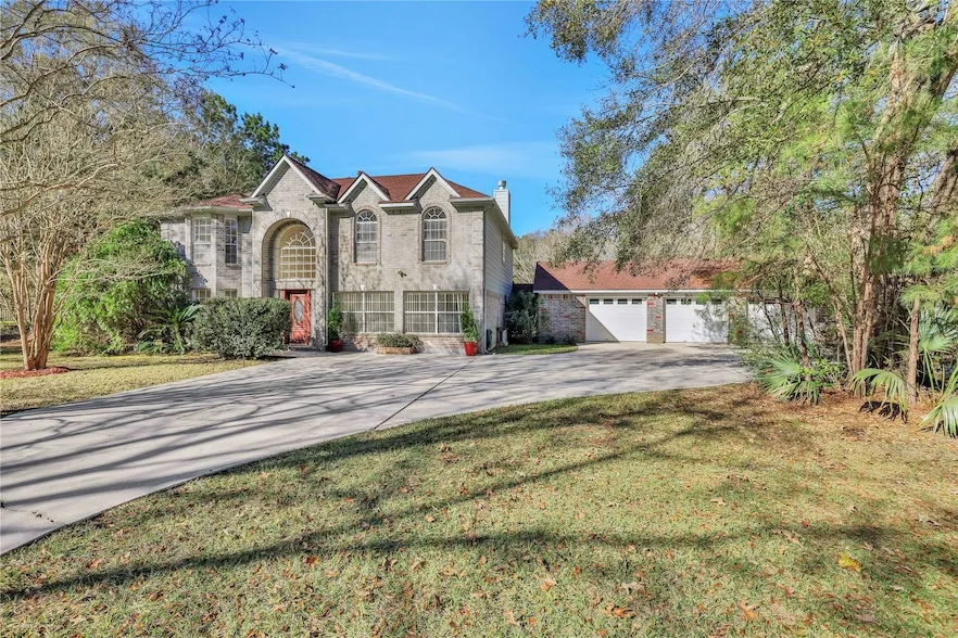 Nestled on 2 acres, this home offers tranquility and privacy, surrounded by mature trees with peaceful, scenic views. The 3-car garage includes a workshop and extra storage, with a convenient drive-through feature to a concrete pad, perfect for projects or additional parking. Inside, the formal dining room offers versatile potential, easily converted to suit your family s needs, whether as an office, playroom, or extra living space. The spacious island kitchen is equipped with ample cabinets for storage and functionality. With two primary bedrooms, four additional bedrooms, and 3.5 baths, there s plenty of room for the whole family. The property offers endless possibilities build your dream pool, add a barn for livestock, build a metal building, or create your ideal space. Located just off Hwy 242, you're only 20 minutes from IAH, 7 minutes from Hwy 99, and 25 minutes to The Woodlands, t...