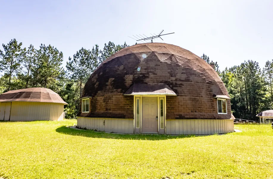 This unique dome constructed home is an eye grabber! Located on Jordan Grove Rd near the town of Dozier in Covington County, AL. According to county records the home measures 1257 sq ft. The 3B/ 2BA home was built in the late 70’s or early 80’s (county records do not have an exact age). The home is dated, but in great shape considering its age and construction. When you walk in the front door a foyer leads to the kitchen on your left and the living room on the right. The living room is exposed to the dome ceiling! From the living room, a spiral staircase leads into the loft/ second story. There are 2 bedrooms and a full bathroom upstairs. The bathroom upstairs features a single vanity, walk in tile shower, and tile floors.