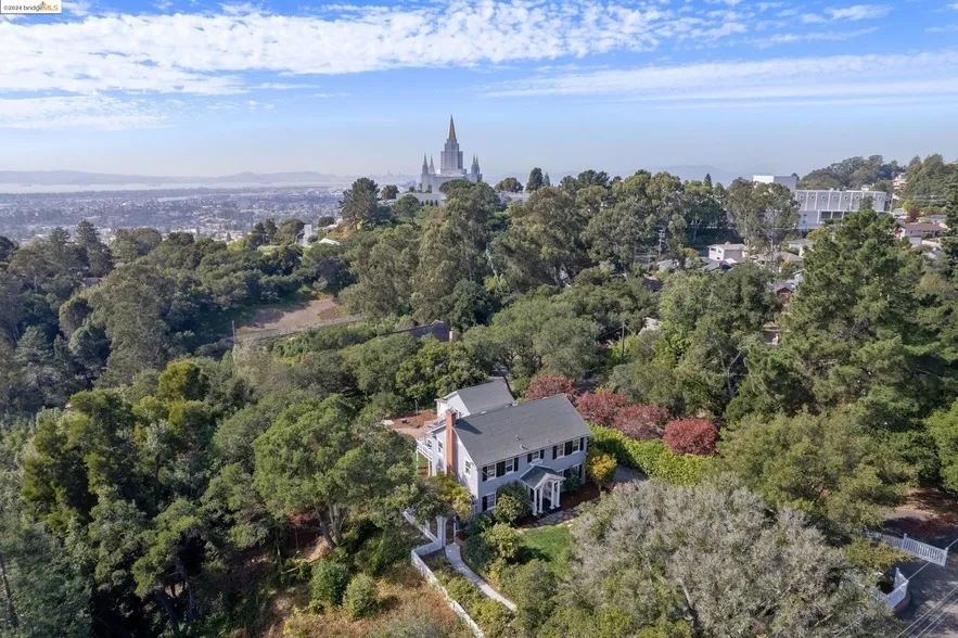 Rare Hillside Villa with Bay Views, an exquisite Colonial/Traditional style home nestled on a wooded oak-filled double lot offers a serene retreat from the urban norm. Two APNs comprising a total of almost a full acre. This elegant residence offers the sought after family compound and offers approximately 3063 measured square feet of living space, featuring 6 bedrooms and four and a half bathrooms, replete with a primary suite that has its own bay view and yoga inspiring deck. The home offers an ideal layout: four bedrooms on the upper level, formal living, family, dining and kitchen with large outdoor deck on the main-middle floor and the lower level offers a laundry room and an au pair suite with its own separate entrance and kitchenette. Additionally a separate structure with a full bath that was once a garage is a delightful guest or office space, and still has an operable garage door. This space is measured at 371 square feet. Together useable space is 3434.