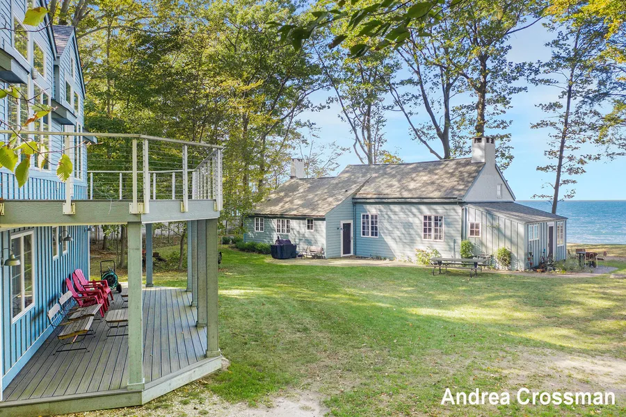 Charming lakeside cottage with a newer guest quarters/garage and 114 feet of private Lake Michigan frontage. The guest quarters feature lakeside upper and lower viewing decks, attached one stall garage, main level bedroom, laundry and half bath. The upper level guest quarters includes two additional bunkrooms with en suite full baths and family room with spectacular views of Lake Michigan. The sweet lakeside cottage main level includes 2 bedrooms, full bath, and large living and sitting area. The upper level main home has a bonus room and loft area that offers more great lake views. Included in the sale is the wooded lot across the street. Subject to municipal approval for the lot splits. Sellers prefer not to close until January 15th, 2022. And that Kitchen light fixture will be replaced