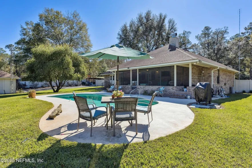 TRULY one of a kind! Current owners have done just about everything. Tiny spring fed creek feeds to little Saint Mary's river... Built in 2000, all brick on a 1 acre parcel. 2 garages have a/c. Plus mower shed has a new roof/new concrete floor. Vinyl privacy fencing. Inground pool just steps from the screened porch but also an upgraded shower & dog wash area w/hot & cold water! On demand tankless water heater., whole house generator and owner owns the propane tank. New 4 ton a/c, cell booster/over-the-air antenna, new plank flooring, replaced MBR sliding glass doors. Kitchen has granite counters, propane stove, slide in/out drawers, appliances stay, breakfast bar in kitchen. Owners suite has tray ceilings, upgrade flush toilets, tub and separate shower, walk-in closets. Well water but iron filter will stay for inside water. Wood burning fireplace w/stone surround and designer trim design. This one does have it all!! See supplemental info for ages of systems. Appliances ages:Stove 11/2024Microwave 9/2022Dishwasher 3/2023Washer 9/2021Dryer 11/2024A/c 1/2023Garage door motors 3/2021Gutters installed 6/2023Generator and propane tank 11/2023Iron filter 3/2021Septic pump out 7/2024Tankless water heater 7/2021 Will leave porch & pool furniture, engineered wood floors need no waxing/shine back up w/sweep and damp mop, wired for cable and antenna in all rooms, great wi-fi reception, attached garage heated and cooled, detached garage a/c,. Power company is FPL. Lowest bill has been $160 and highest is $480. Average is $289There is well water and we have added an iron filter to the water that comes into the house. Outside well and sprinkler does not go through iron filter. No water softener. All windows have blinds.