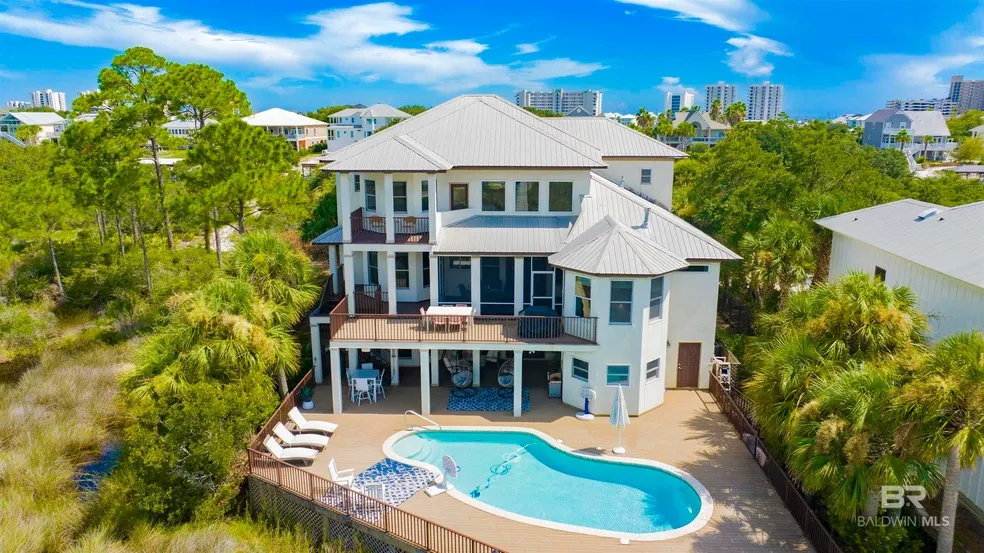 Gated and secure, this waterfront property offers the utmost privacy in one of Alabama's most coveted island communities--truly a rare and prestigious offering. Nestled aside St. John Bayou on Ono Island, this stunning residence features a well proportioned floor plan, spectacular sunsets, 80' of private white sandy beaches, double water frontage, close proximity to The Pass and Ono Bridge all on a a quiet cul-de-sac street. At the heart of the home lie open-concept family and kitchen areas where stunning views serve as the backdrop to daily life. The gourmet kitchen complete with a breakfast area and formal dining room is ideal for casual dining or entertaining. The main level also encompasses a soaring entryway, living room, wet bar, adjoining library and multiple verandas and patios. The main floor primary suite is truly a sanctuary with a private sitting area with fireplace overlooking the bay and a spa-inspired bathroom that includes a freestanding soaking tub, separate shower, generous dual vanities and walk-in closets. With three ensuite bedrooms and loft den upstairs and a spacious two-bedroom first-floor POOLside apartment including covered private entry below, there is abundance of space for both family and guests. Home is serviced by an ELEVATOR and interior and exterior staircases. Exceptional views and only moments from the Gulf. Buyer to verify all information during due diligence.