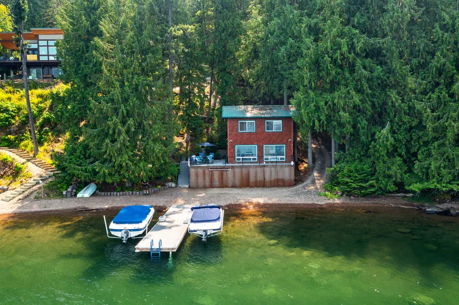 Experience the epitome of lakefront living with this charming 2-bedroom, 2-bathroom waterfront cabin, perfectly situated at the water's edge of Lake Pend Oreille. This 768SF retreat, grandfathered in its prime location with approx. 100FF, offers a unique and rare opportunity to own a piece of paradise. The 1-acre lot features a level build site surrounded by mature cedars on the upper portion, complete with a storage shed, and a sloped trail leading to a tram that brings you down to the cozy cabin. Enjoy stunning north-facing views that stretch from Schweitzer to the Selkirk Mountains, all the way to the Cabinet Mountains. Watch the bald eagles soar while you're having your morning cup of coffee on the deck. Just steps away from your private beachfront, you'll find a Trex dock and mooring buoy, perfect for boating and water activities. The short boat ride to downtown Sandpoint offers access to amazing restaurants, art galleries, and local shops, providing the best of both worlds – serene lake life and vibrant town amenities. Don't miss out on this rare opportunity to embrace lake life at its finest. Act now to make this picturesque waterfront cabin your new home!