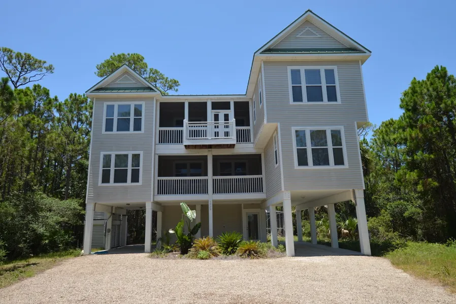 Two master suites!Privacy from this wooded lot located in the gated SGI Plantation community. Open dining/kitchen/living area, tile floors, furnished, private pool with enclosed screen, concrete pilings.Community tennis and pickle ball courts, 2 swimming pools, air strip, 24 hr security.