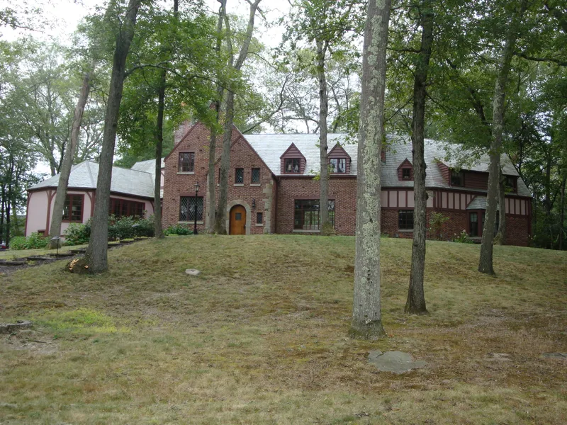 Truly a one of a kind home starting with the rounded solid oak front door! Magnificent 13 room English Tudor style home on over an acre of land. The curvature of the design embraces the lot perfectly. The incredible center island kitchen and adjoining family room are 2005+- additions. Top quality appliances, granite, custom cabinets and hardwood flooring in the kitchen. Vaulted ceilings in family room. Outstanding woodwork throughout with oak doors, 3 staircases, exposed beams and many built-ins. Five unique fireplaces. Dining room has built-in corner hutches. Library with hand painted mural above the fireplace. 1st floor master with fireplace and private jacuzzi bath. 2nd floor master with fireplace and private bath. Abundance of leaded glass. Cinderellas private turret room must be seen! Over 5,400sf of unmatched quality living space! Could not be reproduced for twice the price!