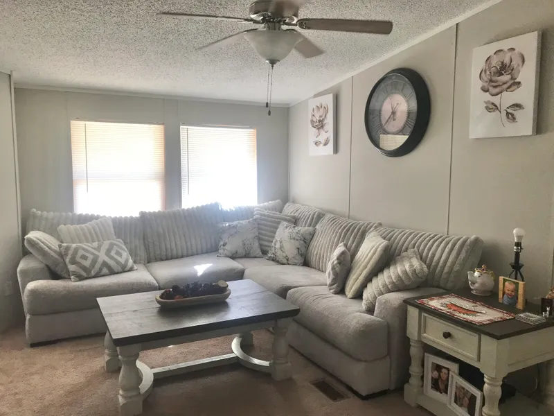Peaceful Country Living with Room to Breathe. Escape to this serene 3-bedroom, 2-bath doublewide home offering 1,680 square feet of comfortable living space, perfectly situated on a full acre of gently rolling countryside. Inside, a spacious living room welcomes you with a cozy fireplace and abundant natural light streaming through large windows. The formal dining area flows into a well-appointed kitchen featuring generous cabinetry, a center island, and easy access to the oversized laundry room. Thoughtfully designed for privacy, the split-bedroom layout places the primary suite at one end of the home. The expansive master bath includes a garden tub, walk-in shower, dual vanities, and two separate closets. On the opposite side, two guest bedrooms share a full hall bath—ideal for family or visitors. Unwind on the covered front porch and take in the peaceful views of open land and quiet skies. Ramp access. This property offers the perfect blend of comfort, space, and rural charm—ready for you to call home.