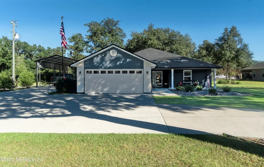 Welcome to your perfect blend of comfort and country charm!Set on 1.02 acres, this 3-bedroom, 2-bath home built in 2021 offers modern living with plenty of space to relax and entertain. The open floor plan provides a smooth flow throughout the main living areas Convenient 2-car attached garage gives easy home access while an additional 2-car garage/workshop, ideal for projects, storage, or extra vehicles. Two RV or toy covered canopy: 1-18 x30 with electric and back RV space 24 x 35 with 500 gal Septic and 50 Amp electric; perfect for visiting guests or prepping your RV for your next adventure. Step outside to your spacious back porch, perfect for cooking out and enjoying quiet evenings by the fire pit. Sit back, relax, and take in the peaceful views and local wildlife. Also 6 zone sprinkler system, Leaf Gutters on house and back garage, genrac w/2 gas tanks, alarm system and camera stay...