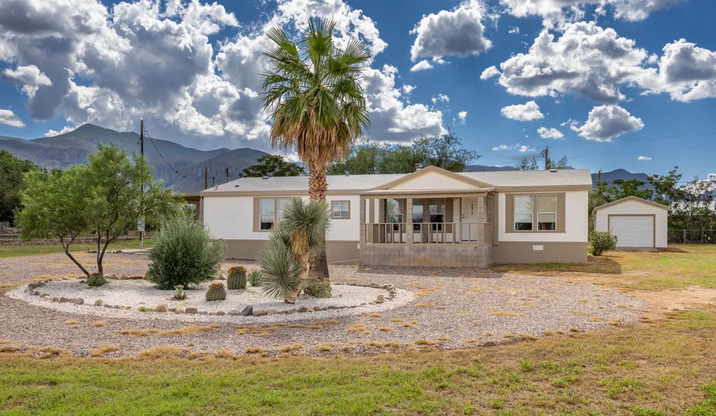 Public Remarks: Move-in ready 3 bed, 2 bath home with a detached 1 car garage! This 2000 Palm Harbor Home features vaulted ceilings, a Spacious kitchen with breakfast nook & walk-in pantry and Split bedroom floorplan. Dual sinks in the master, separate garden tub & shower & walk-in closet. Extra large living room with corner fireplace. Covered deck on the front & side of home to enjoy those mountain views! It is located on a fully fenced acre with an RV gated entry. Close to Ft Huachuca and only minutes to downtown Sierra Vista.