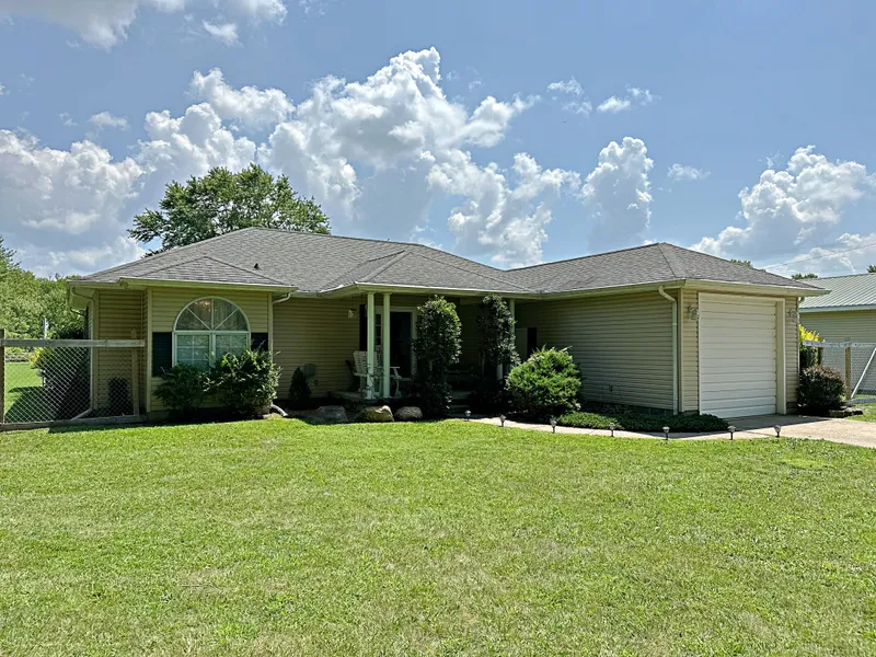 Nestled on the outskirts of town on 1 acre +/-, this charming home combines the allure of rural living with modern convenience. Step inside to discover an open-concept layout that seamlessly merges the living room, dining area, and kitchen, creating an inviting space for gatherings and relaxation. The updated kitchen features ample cabinet space and a spacious bar that provides additional workspace and seating. French doors in the dining area open up to the third bedroom, inviting you to relax and enjoy the picturesque views of the surrounding countryside. Retreat to the Primary Suite, which offers an adjacent bathroom with double vanities, soaking tub, shower, and ample closet space. Two additional bedrooms and two additional bathrooms provide flexibility and convenience for guests or family members. The one-car attached garage currently provides a workout area and the large detached ga...