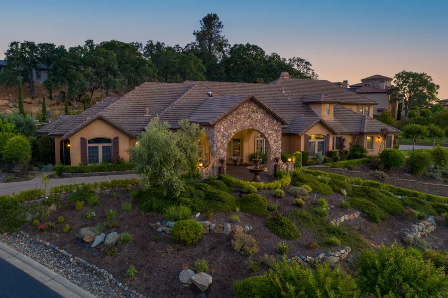 Breathtaking views of Folsom Lake, Sierra Nevadas and city lights from this incredible 1 acre gated estate. This expansive Santa Barbara style home lives like a single story w/ 4 ensuite bedrooms on the main level. A gorgeous home office features a fireplace & custom cabinets. The remote upstairs bonus room and 5th en suite bedroom boast gorgeous Folsom Lake views. The chef's kitchen features furniture-grade cabinetry, granite slab counters, professional-grade appliances & breakfast nook. The serene owners' suite features vaulted ceilings, fireplace, a huge walk-in closet, & spa-like bathroom with soaking tub. The home offers craftsmanship like no other with 6 fireplaces, solid wood plank floors, wood-cased windows, crown molding, and solid core doors. Step straight from the great room to the resort-style backyard complete with covered loggia, Tommy Bahama-inspired pool bath, freeform pool with baja shelves, fireplace and views galore! Oversized garage w/epoxy floors. Owned Solar!