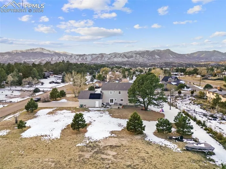 Dreaming of a semi-rural lifestyle in the heart of the city? Your homestead awaits in The Falcon Estates. This coveted neighborhood blends urban convenience with country living, fostering a shared appreciation for space and its rustic charm. Perfect for those craving city amenities with a rural touch, this rare 4-bedroom, 3-bathroom home with a 3-car garage offers access to top-notch schools. Nestled on a one-acre corner lot, this property provides ample space and privacy. A welcoming exterior greets you with a spacious front porch boasting breathtaking mountain views. Inside, you'll find an open-concept main level. An inviting living room with mountain views and new carpet flows seamlessly into the kitchen and formal dining room. The kitchen features granite countertops, a stone-accented breakfast bar, newly refaced white cabinets, stainless steel appliances, and updated lighting. The main level also includes a sitting room with mountain views, access to the three-car garage, a powder room and a cozy office with french doors. Sliding glass doors open to a backyard complete with a relaxing patio, children's play set, and offers plenty of gardening space or room to play on the one acre lot. Upstairs, an expansive master suite offers a true retreat with its en-suite bathroom. Three additional bedrooms and a full bathroom complete the upper level. This home's appeal extends beyond its walls: situated in the highly sought-after D-20 school district, it's minutes from dining and shopping at Falcon's Landing and other establishments on Academy Boulevard. Nature lovers will appreciate the short drive to stunning outdoor spaces like Ute Valley Park and Blodgett Peak. Recent upgrades include fresh interior and exterior paint, new carpet, solar panels, granite countertops in the kitchen, and new light fixtures on the main level. Don't let this opportunity slip away schedule your viewing today!