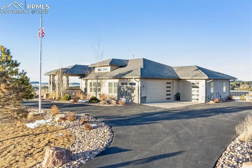 Welcome to this remarkable 4-bedroom, 4-bathroom former model home, a 2017 Parade of Homes showcase that remained unoccupied until 2023. Nestled on a pristine one-acre lot, this property offers breathtaking views of Pikes Peak and the surrounding mountains. A charming front courtyard with a cozy outdoor gas fireplace creates a warm and inviting entrance, perfect for gathering with friends and family. At the heart of the home is a spectacular gourmet kitchen, highlighting elegant marble countertops, high-end appliances, and sophisticated soft-close dovetail alder cabinetry, expansive walk in pantry. The kitchen flows effortlessly into the vaulted great room, where a built-in gas fireplace, mounted tv along with wood beam accents add a cozy ambiance. Hardwood floors with an espresso finish grace the front entry, great room, dining area, and kitchen, bringing timeless elegance to the space. Trendy lighting throughout enhances the home's modern appeal. The primary bedroom is a serene retreat with a coffered ceiling, spa-like ensuite featuring a luxury shower, dual vanity, and a spacious walk-in closet that conveniently connects to the laundry room. A versatile bedroom or study on the main level offers flexible living options, while the mudroom off the garage features bench seating for added convenience. The finished walkout basement is designed for entertainment, featuring a spacious family room, game area, wet bar, beverage refrigerator, and a flex room pre-wired for a home theater. Multiple outdoor spaces to soak in the panoramic views and entertain guests in style. Looking for your husband? He may be out in the oversized 3-car garage with epoxy flooring, Lenox heating and cooling, newly installed cabinets and work bench, we made too comfortable! Circular driveway enhances curb appeal and allows for convenient parking. This extraordinary property seamlessly combines luxury, comfort, and sophisticated design. New King Soopers just 10 minutes away.