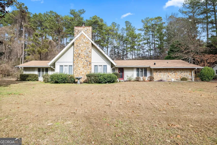 Welcome to this warm and inviting 4 bedroom, 3 bath home that blends natural wood, stone accents, and classic 1970s contemporary charm. The striking front gable and stone chimney create a memorable first impression, and inside, the spacious living area welcomes you with dramatic beamed ceilings, generous light, and a mix of wood and tile flooring that gives the main level a clean, unified look. The extra large primary suite on the main floor provides room to unwind with space for a sitting area or quiet retreat, while the upstairs bedroom suite offers comfortable carpet and added privacy for guests or family members. The expansive, updated kitchen is designed for both everyday living and easy entertaining, featuring abundant counter space, a cheerful breakfast area, and thoughtfully included appliances. A refrigerator is already in place, and the trash compactor adds extra convenience for busy routines. The home also includes a water softening system that enhances daily comfort. Just off the kitchen, a separate laundry room adds to the home's practical layout. Outside, the screened porch provides a peaceful place to relax, enjoy the breeze, or look out onto the natural surroundings. With its inviting atmosphere, spacious design, and blend of character and comfort, this home offers a welcoming place to settle in and make your own.