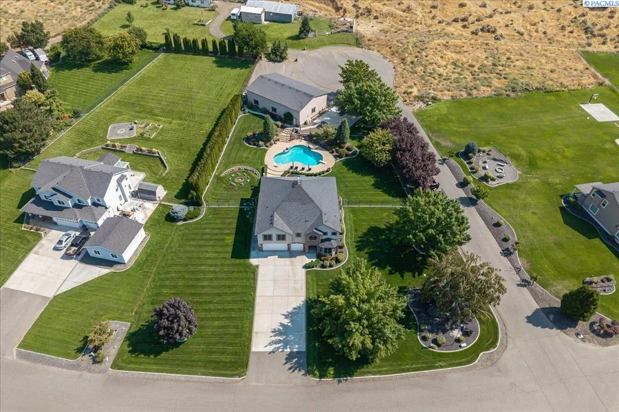 MLS# 289723 Dream home living just moments from the river—complete with everything on your wish list! Set on a private, park-like 1-acre lot, this luxurious and spacious property offers a stunning home, resort-style pool, and an impressive 40x60 shop. Step inside the 4,781 sq. ft. home to discover an inviting open-concept layout filled with natural light and rich hardwood flooring. The welcoming living room is anchored by a beautiful double-sided fireplace shared with a dedicated office featuring custom built-ins—perfect for working from home or creative pursuits. The chef’s kitchen is a true showstopper, boasting a large island/breakfast bar, granite countertops, an abundance of custom oak cabinetry, tile floors, a spacious pantry, double ovens, and both casual and formal dining areas ideal for everyday living and entertaining. The home offers 5 bedrooms and 3.5 bathrooms, including a primary suite that serves as a private retreat with vaulted ceilings, a cozy sitting area, a spa-inspired ensuite bath, and a generous walk-in closet designed for effortless organization. Thoughtfully designed throughout, this home seamlessly blends comfort, style, and functionality for exceptional indoor-outdoor living. Outside, beautifully landscaped grounds and tranquil water features create a serene backdrop for relaxation and entertaining. Enjoy sunny days by the grand pool, evenings around the fire pit, or gatherings under the expansive covered patio. The fully fenced yard is prepped for a future hot tub and even includes a basketball half-court for added fun. Completing this remarkable property is the fully insulated and heated 40x60 shop, featuring high ceilings, built-in shelving, and a convenient cul-de-sac-style drive for easy access and parking. This is a rare opportunity to own a truly exceptional property—don’t miss your chance to make it yours.