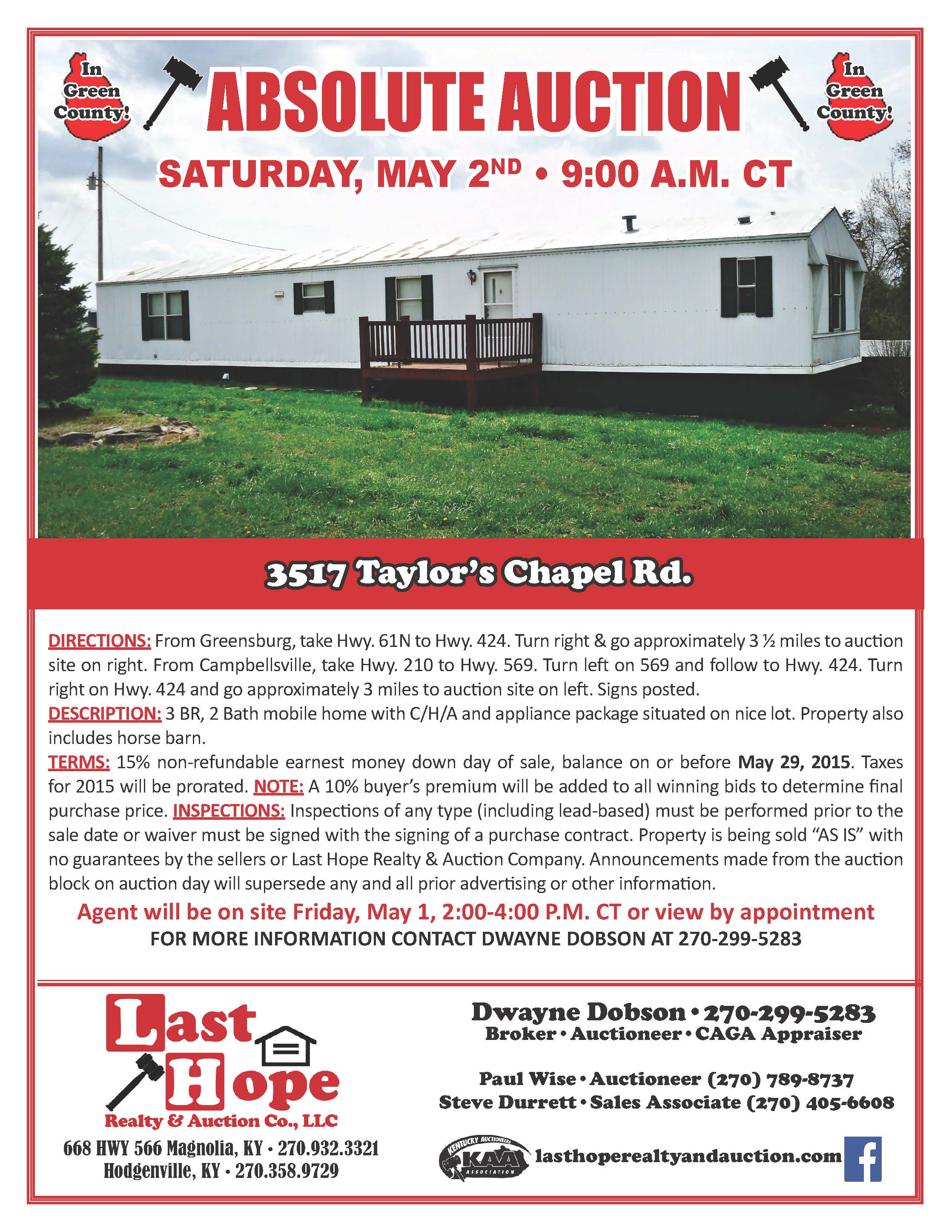 DESCRIPTION: 3 BR, 2 Bath mobile home with C/H/A and appliance package situated on nice lot. Property also includes horse barn.TERMS: 15% non-refundable earnest money down day of sale, balance on or before MAY 29, 2015. Taxes for 2015 will be prorated. NOTE: A 10% buyers premium will be added to all winning bids to determine final purchase price. INSPECTIONS-Inspections of any type (including lead-based) must be performed prior to the sale date or waiver must be signed with the signing of a purchase contract. Property is being sold AS IS with no guarantees by the sellers or Last Hope Realty & Auction Company. Announcements made from the auction block on auction day will supersede any and all prior advertising or other information. AGENT WILL BE ON SITE FROM 2:00-4:00 FRIDAY, MAY 1ST OR VIEW BY APPOINTMENT. CALL DWAYNE DOBSON AT 270-299-5283 FOR MORE INFORMATION. Last Hope Realty & Auction Co. Dwayne Dobson, Broker/Auctioneer/CAGA Appraiser.