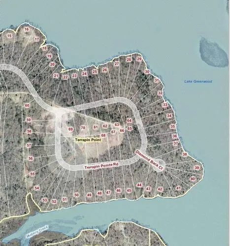 1-acre "interior" lot in gated Terrapin Pointe community on Saluda River/Lake Greenwood. Enjoy lake access on 11,400-acre Lake Greenwood spring-summer-fall without paying waterfront prices! Community has nice boat ramp, plenty of trailer parking while you're out enjoying the lake, and day slips. Great building site. Gorgeous hardwood trees, underground utilities including natural gas for your stove/fireplace. Well & septic required. Covenants require min. 1400sf home with min. 1000sf footprint, & min. 2-car garage. No mobiles. Serene natural environment. Less than 15 min. into micro-metro city of Greenwood, close to small towns of Hodges and Ware Shoals, quick 30 min. zip to/from Greenville.