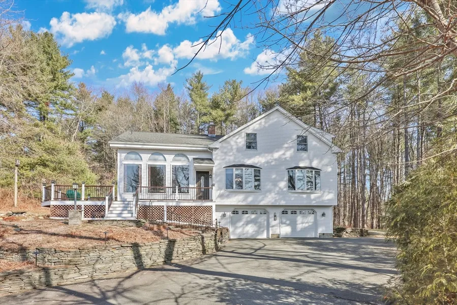 Nestled on a private 1-acre lot, this stunning home offers elegance and comfort. Enjoy nature from the (2021) Trex deck before stepping into a grand great room with soaring ceilings, arched windows, and a floor-to-ceiling hearth with a Harman pellet stove. The open kitchen boasts silestone counters, stainless steel appliances, and gleaming hardwood floors. A sunroom with vaulted pine ceilings, skylights, and wall-to-wall windows leads to a stone patio and serene koi pond. The first-floor primary suite features a spa-like bath with quartz counters, custom cabinetry, heated tile floors, and a walk-in shower. Upstairs offers two bedrooms and a versatile bonus room. With a 2-bay attached garage, 200 sqft of finished basement space, mini-splits for A/C, and meticulously maintained mechanicals, buyers can move in with confidence-nothing left to do! Thoughtful design, abundant storage, and a peaceful setting just minutes from the Mass Pike make this home a must-see. Schedule your private tour