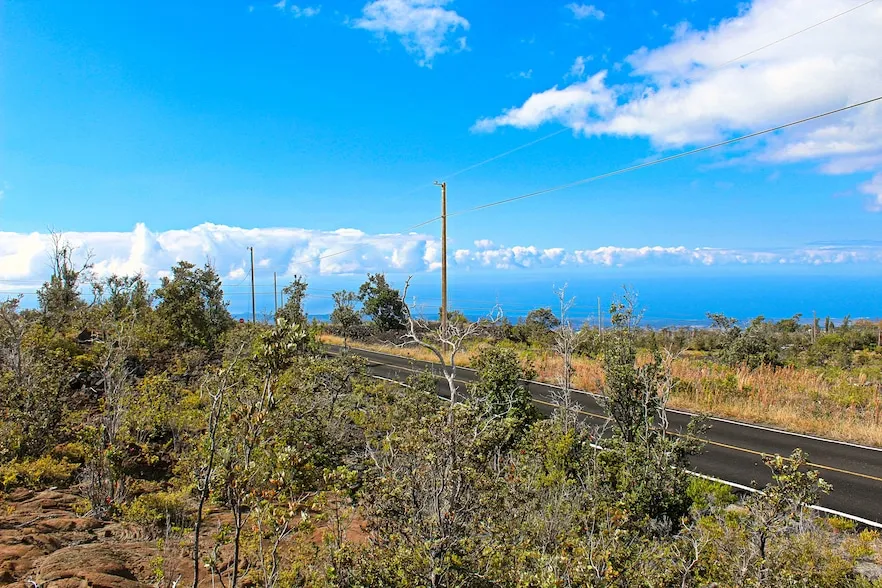 This property is vacant land with lots of pahoehoe lava with 'a'a lava on the back portion of the property. Native plants & young 'ohi'a trees. Breathtaking ocean & coastline views during the day, including South Point. Amazing star gazing at night, dark enough to see the Milky Way! Warm days and cool nights. Overhead power available via SSPP, or go off-grid with solar! All 4 corners of property are staked already. Convenience is key, with essential amenities just a short drive away. Down the hill, you'll find gas stations, grocery stores, shopping centers, a hardware store, propane/rentals, local restaurants, a Post Office, and an auto parts store, ensuring all your daily needs are met with ease.