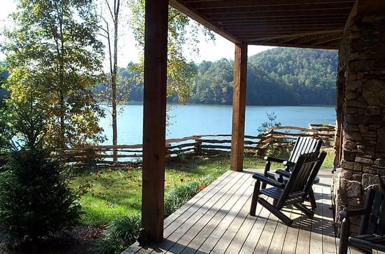 The Webb House - This custom built lakefront home has many features. Western red cedar siding and stacked Tennessee field stone, fireplaces and a wood stove hearth. Tongue and groove interior walls and ceilings and exposed wood beams set off the interior finish of this unique home in one of the most awesome lakefront settings. Take a look at the landscaped gardens and mountain views and dock on the wwater and you've found your new home. $695,000 with an additional lakefront lot available next door.