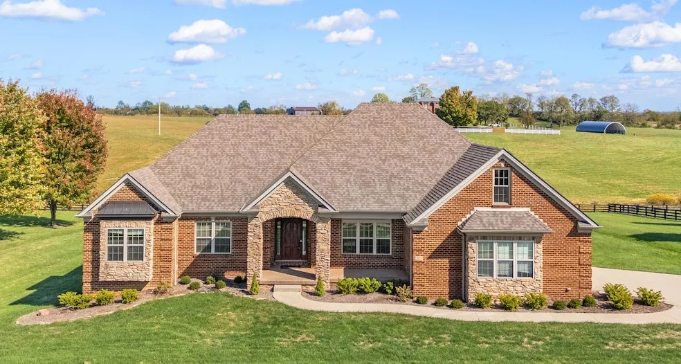 This showstopper custom ranch on a full finished basement was designed for comfort, style, and space for all. Featuring 5BR/3.5BA's, this home is the perfect mix of open-concept living with thoughtful details throughout. The main level welcomes you with a foyer, formal dining room, private office, and a great room with vaulted ceiling and gas log fireplace. The open kitchen offers granite countertops, stainless steel appliances, and a spacious breakfast bay overlooking picturesque farmland. The split-bedroom layout provides a private owner's suite with a huge walk-in closet and spa-like bath, plus two additional bedrooms with a shared Jack-and-Jill bath. The main floor also features a spacious utility room with ample cabinetry and a utility sink. The finished basement is perfect for multigenerational living or entertaining, complete with updated laminate flooring, a large kitchenette, op...