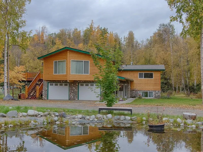 Exceptional Log & Real Stone Prow Front home located within minutes to Wasilla!Situated in 3367 square feet, this 4 bedroom, 2.75 bath tri-level home is truly paramount! (more)Enclosed tiled artic entry with can lighting, large entrance with oversized staircases to upper and lower levels. Custom High End Kitchen with recessed lighting, concrete countertops, granite backsplash, Pot filler faucet above the Commercial oversized gas range, wall oven, built in microwave, wine cooler, island with water, under cabinet lighting, walk in pantry with laminate flooring. The living room offers a very high tongue and groove knotty pine vaulted ceiling, with open beam and 4 sky lights. Gas fireplace and new carpeting. Custom railing to enter living room and master suite with lighted etched glass encasement of Alaska wildlife! Back door from living enters an approximate 300 sq. ft. sun room with glass windows abound! Oversized bedroom and full bath with large soaker tub on this level. Master Suite is greatly oversized with gas corner fireplace, slider to exterior decking with custom engraved Alaska wildlife on posts, metallic ceiling with ceiling fans, large closets with full length mirrored doors, his and her sinks, oak cabinetry, in bathroom, large walk in tiled double head shower with custom door and pan, recessed lighting and sauna too! Lower level offers a very large, oversized family room, exterior door provides access to large grow area directly under the sun room with running water. 2 large bedrooms, full bath and separate oversized laundry room. All this along with a 2 car garage, this home has exceptional landscaping with rock landscaping and flowers around the pond which has a separate well for irrigation for the , including a horseshoe shaped driveway, plenty of parking for your RV's, Boats and Toys! Truly an Alaskan Gem!