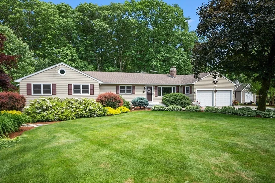 A standout in this Hitchin'post neighborhood. Gorgeous, meticulously-landscaped full acre lot. Akin to living in an arboretum! The Sellers have loved living in this solid, Hicks-built, spacious, embankment ranch style residence. This home boasts an oversized formal living room with two sliders for deck access, perfect for entertaining; dining room with fireplace; fully-applianced kitchen with abundant cabinetry, and a convenient granite peninsula which accommodates stools for informal meals. A master bedroom suite with walk-in closet and full bath; three additional bedrooms and additional full bath round out the main floor. The walkout basement contains a family room with gas-fired stove, an office area, half bath; and hobbyist/workshop area. Plenty of storage. CAC; newer Anderson windows; Smith & Noble custom shades; Pella doors. Whole house, stand-by Generac generator. A large Reeds Ferry shed handily stores seasonal equipment. Two car garage. Auxiliary driveway for boat or RV.