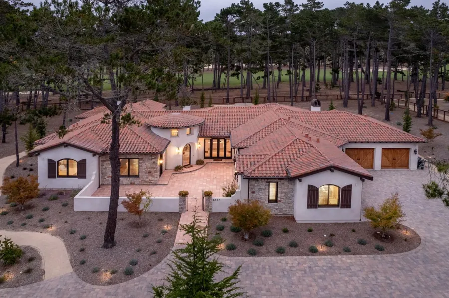 Rich in the tradition of the Old-World era, this new Mediterranean-style home on 1 acre makes an impressive statement of luxury and design. Sited on the 13th fairway of Poppy Hills Golf Course, this spacious 5228 sf, single level home blends past and present with rich textures and architectural details. With delightful arched windows and entryways, beamed ceilings, and alder wood cabinetry, stone floors, French doors, and 12' ceilings, this pristine 5-bedroom and 5.5-bathroom home with 2 separate attached garages also features an alder wood library with a labyrinth ceiling and French doors opening to a tiled courtyard with decorative wrought iron. The chef's kitchen merges tumbled marble and granite with custom cabinetry and stainless steel appliances. The backyard covered loggia with travertine patio and steps provide a serene outdoor living space to relax and enjoy the beautiful golf c...