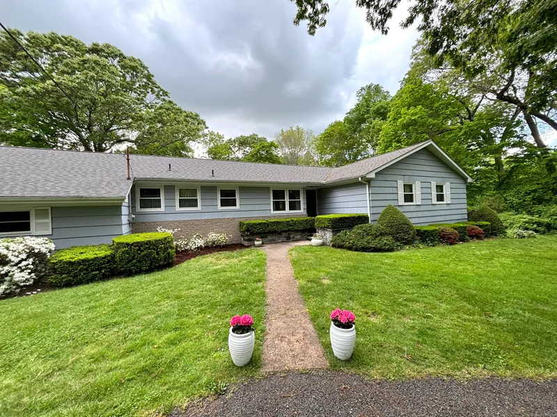 Move right in to this furnished 3 bedroom, 2 1/2 bath ranch with Mid Century flare, close to downtown Guilford. Spacious rooms include an eat-in kitchen with plenty of cabinet space, a primary bedroom with walk-in closet and en suite full bath, a wall of windows overlooking the backyard in the living/dining room combination, a fireplace in the den with a sliding door, two guest rooms, a guest bathroom and a half-bath. A two car attached garage and circular driveway makes entertaining easy. Full basement with hatchway for easy access from outside. The historic Guilford green, schools and shopping are all a short distance away. One floor living at its best.