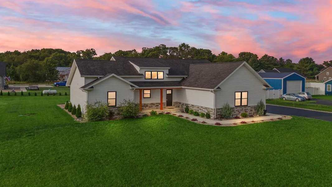 Not your ordinary farmhouse... This light & bright custom designed and built split ranch floorplan is better than new! Features include a sun room, covered front & back porches with cedar beams & posts, beautiful custom kitchen with upgraded cabinetry, granite countertops and stainless steel appliances. Thoughtfully decorated with designer accents, tiled bathrooms, luxury vinyl plank flooring throughout and upgraded lighting to included both recessed lights & overhead fixture in all bedrooms. Crawl space is accessible from the laundry room and is clean & dry for all your storage needs. Oversized three car attached garage has epoxy floor and closet to house all mechanicals. The outside space has been freshly landscaped, with a new 16 x 24 shed with electric, garden area & expanded sun patio added within the last year. Plenty of additional green space on this 1 acre lot to add a pool or additional amenities. Come take a look at this meticulous home today!