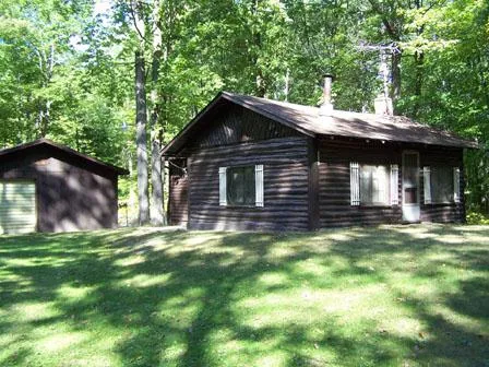 LOG CABIN IN THE WOODS - great for hunting, fishing, snowmobiling and other outdoor fun. This two bedroom cabin has a free standing fireplace and large two-car garage with front and rear doors for easy in and out of RV toys. Easy access to nearby lakes and trail system. Cabin comes furnished with sparkling clear well water $ 32,500 A-2274