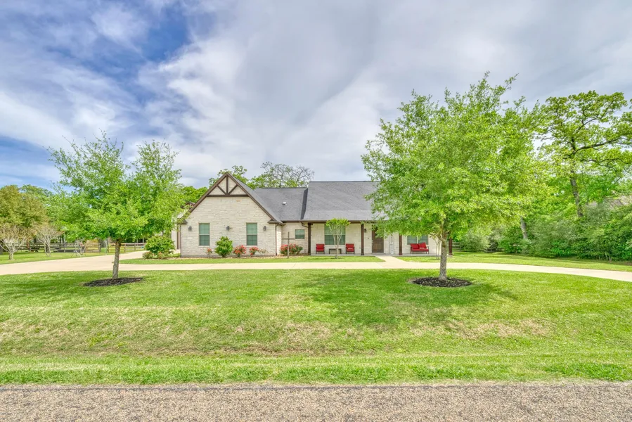Welcome home to 1772 Red Haven Ct! Located just a short drive down scenic Peach Creek Drive, you'll find this beautiful custom built stone home on 1 acre in the popular Peach Crossing neighborhood in College Station. 2,802 sqft 4BR/3BA plus a study/flex space will not disappoint, with lots of natural light throughout. The open concept living area with high ceiling and floor to ceiling rock fireplace, seamlessly flows into the kitchen with elegant granite countertops, knotty alder wood cabinets and dual fuel oven with 48in gas range. Very spacious bedroom located upstairs that could also be used as a media or game room. The property also includes fantastic outdoor amenities such as a 16x50 RV garage with spray foam insulation, full 50 amp hookup/water/sewer and an additional 30amp RV hookup on the back of the main house. Inside garage you'll also find a 15x20 room that can be used as a guest room/MIL suite or gameroom with a full bath and kitchenette. Extensive flat work connecting the main home and outdoor structures, including outdoor patio and a circle driveway in front. Lots of space to run and play in the backyard or relax and entertain your guests on the back patio. Outdoor kitchen with granite counter, sink, 2 burner gas range and a spot for a mini fridge. Recent updates include new tankless hot water heater, outdoor exterior paint and AC in guest room. Neighborhood has a large pond and walking trails! Don't miss out on the opportunity to make this stunning home yours!