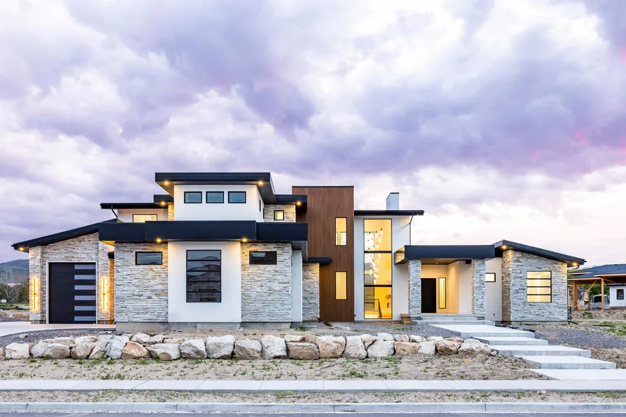 This gorgeous custom mountain modern 2-Story with ADU is in Bluffdale and sits on a fantastic 1 acre lot. Enjoy an amazing lifestyle in this beautiful home with a luxurious primary suite, an enormous gourmet kitchen, a large covered deck and an expansive family room all on the main level. At the heart of the home, you find the gourmet kitchen that features double islands, cabinet-matching Thermador refrigerator & freezer, double-ovens, a pebble ice maker, wine fridge, 2 dishwashers, butler's pantry with freezer, cappuccino machine and even an Elkay bottle filler. Upstairs you will find 2 bedrooms with en-suite bathrooms, an exercise/office/library space that overlooks the family room, a wet bar and access to the covered roof deck that is plumbed for gas, so you can install a future fire pit, to enjoy the views and be connected with all that is going on in the backyard. Downstairs you will find 3 more bedrooms, a space that is prepped for a basement kitchen and tons of storage! Additionally, the basement features an ADU/Mother-in-law apartment with separate entrance, its own family room, kitchen, pantry, laundry, bedroom and bathroom. The home features an extra-large garage with a 13.5' garage door and 29' of depth, perfect for your boat or RV. Without a boat or RV, you could easily fit 5 cars in this garage. With this 1 acre lot, you have a lot of options for landscaping, detached garage, pool, pickle ball or tennis court and anything else you can dream of. At the back of the home is an unfinished bathroom, perfect for pool or backyard use, so you don't have to go back through the home. Preparations have been made for water, gas and power for pool and detached garage. A few punch list items are still being completed. The fireplaces have been tiled since photos.